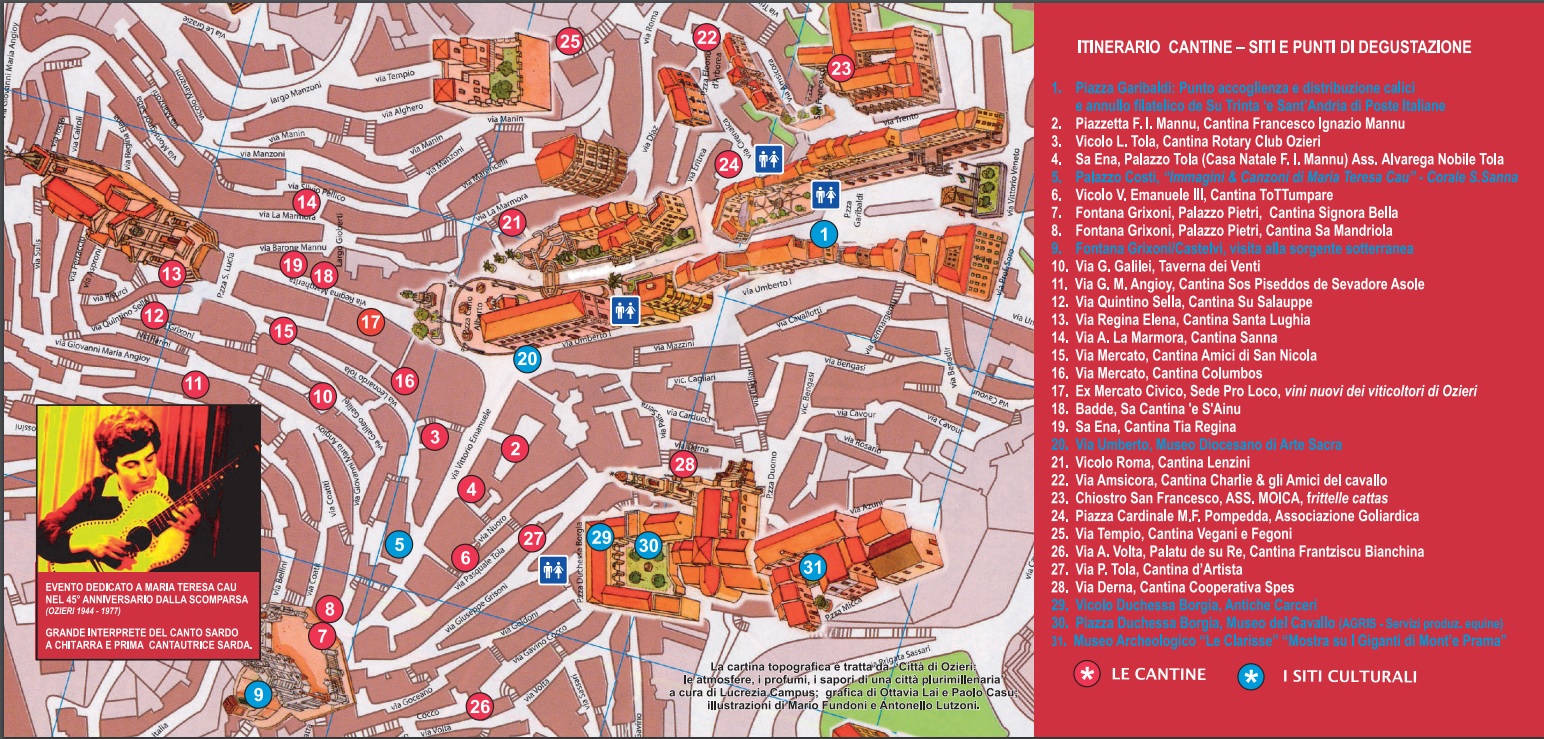 Per informazioni sulla manifestazione, ritiro cartina itinerari, carta dei vini e calici, informazioni su esibizioni di cori, balletti e cantadores, rivolgersi nel punto di accoglienza aperto in Piazza Garibaldi (n. 1 itinerario).