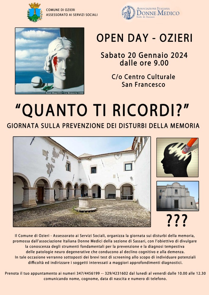 Il Comune di Ozieri - Assessorato ai Servizi Sociali, organizza la giornata sui disturbi della memoria, promossa dall'associazione Italiana Donne Medici della sezione di Sassari, con l'obiettivo di divulgare la conoscenza degli strumenti fondamentali per la prevenzione e la diagnosi tempestiva delle patologie neuro degenerative che conducono al declino cognitivo e alla demenza. In tale occasione verranno sottoposti dei brevi test di screening allo scopo di individuare potenziali difficoltà ed indirizzare i soggetti interessati a maggiori approfondimenti diagnostici.