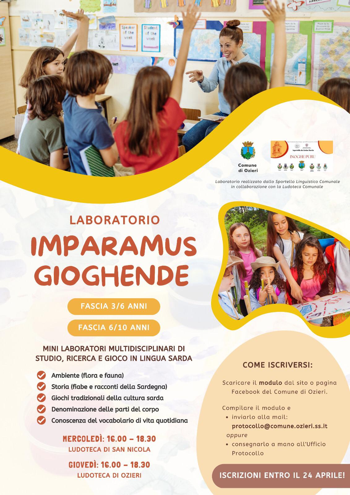 ''Imparamus Gioghende'' è un laboratorio promosso dall'Istituto Chircas di Buddusò attraverso lo sportello linguistico comunale di Ozieri in collaborazione con l'Assessorato alla Cultura e ai Servizi Sociali, vedrà protagonisti i bambini delle Ludoteche comunali nelle sedi di Ozieri e San Nicola nelle fasce di età 3/5 anni, 6/10 anni. Invitiamo i genitori ad iscrivere i propri figli utilizzando il modulo predisposto. Scadenze iscrizioni 21 aprile.