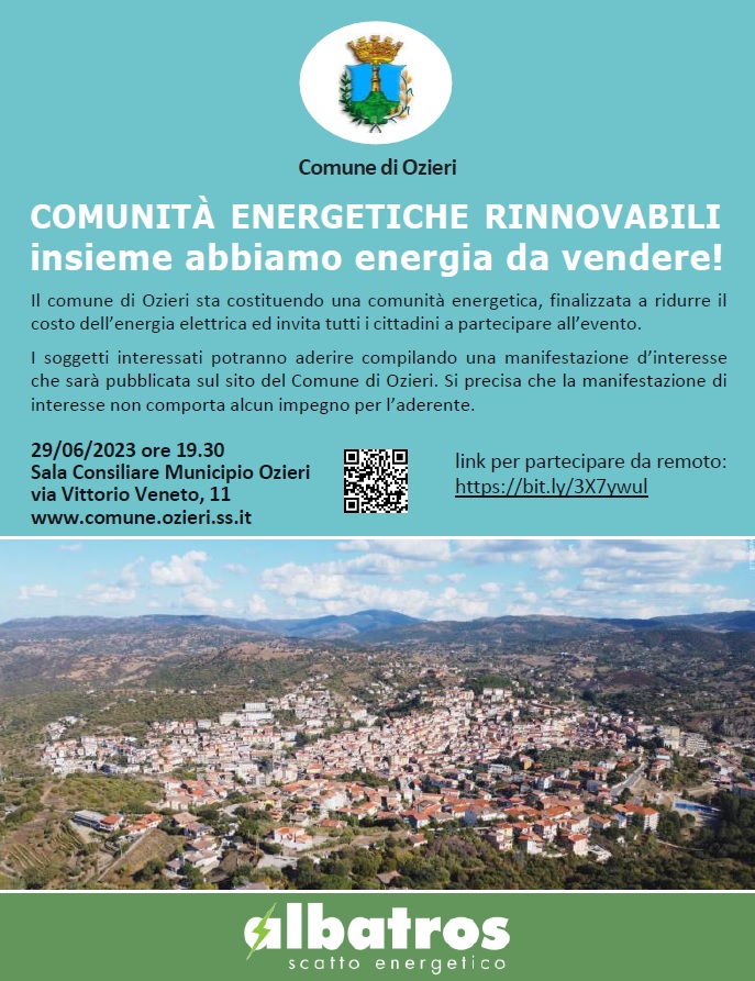 Il Comune di Ozieri sta costituendo una comunità energetica, finalizzata a ridurre il costo dell'energia elettrica ed invita cittadini e imprese a partecipare all'evento di presentazione del progetto previsto