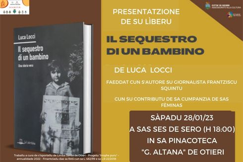 Sàpadu 28 de su mese de Ghennarzu de su 2023 a sas ses de sero (h.18.00) in sa Pinacoteca Tzitadina ''G.Altana'', s'Istitutzione de Santu Micheli (San Michele) e s'Assessoradu a sa Cultura de su Comune de Otieri organizant sa presentatzione de su lìberu autobiogràficu ''Su secuestru de unu pitzinnu'' de Luca Locci.